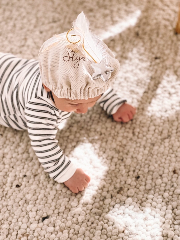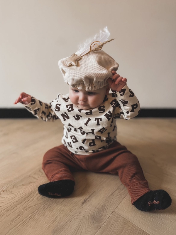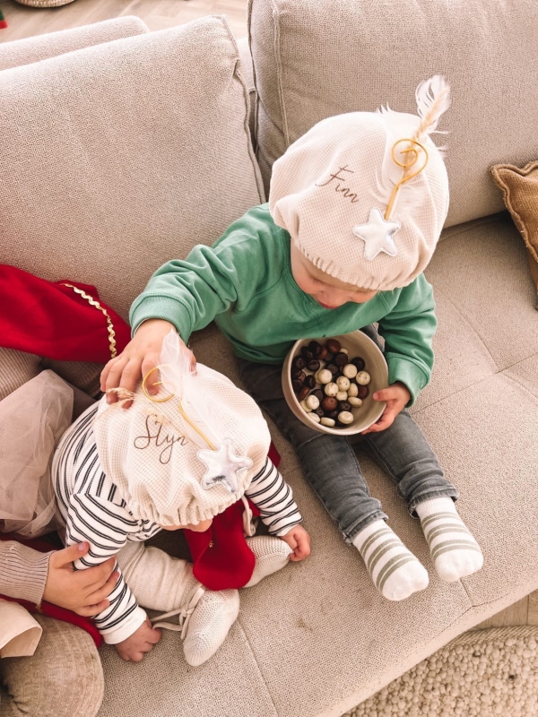 Maak de eerste Sinterklaasviering van je kleintje extra speciaal met deze lieve, gepersonaliseerde pietenmuts. De trendy zandkleur, gecombineerd met een subtiele gouden ster, geeft een moderne draai aan de klassieke traditie. Laat de muts bedrukken met de naam van je kindje voor een uniek en persoonlijk aandenken aan dit bijzondere feest. De zachte stof zorgt voor een comfortabele pasvorm, perfect voor de allerleukste foto's en een onvergetelijk Sinterklaasfeest!