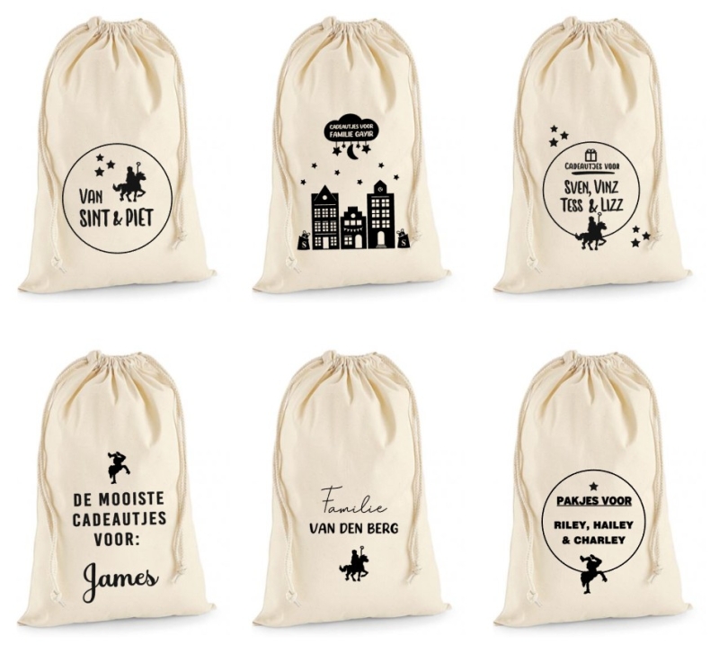 • Cadeau zak Cadeautjes krijgen met sinterklaas is natuurlijk al speciaal, maar als deze cadeautjes komen in een gepersonaliseerde zak met je (familie) naam, is dat extra speciaal. Deze sinterklaas cadeautjes tas met naam is verkrijgbaar in naturel en zwart.
