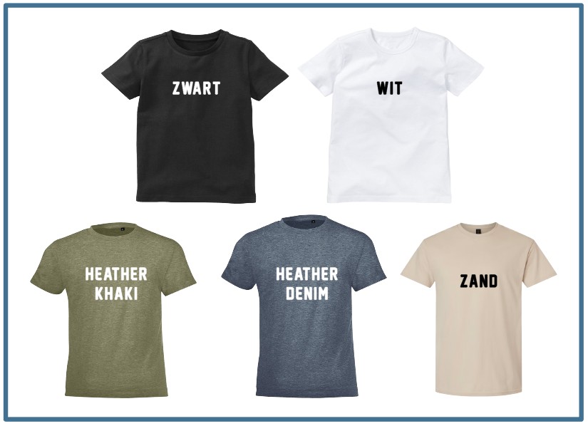 De twinning shirts zijn verkrijgbaar in meerdere kleuren: zwart, wit, Heather khaki, Heather denim en oranje. De oranje variant is extra populair tijdens Koningsdag en grote voetbaltoernooien zoals het EK of WK. Alle shirts hebben korte mouwen en zijn comfortabel om te dragen.