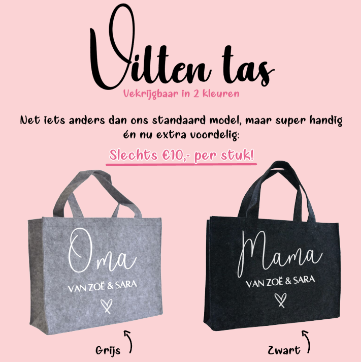 | Vilten tas | Vilten tas bedrukken | Moederdag cadeau | Moederdag cadeau voor oma | Vilten tas Oma + namen kinderen | Gepersonaliseerde tas | Tas met naam | Viltentas bedrukken | Moederdag cadeau namens kinderen |