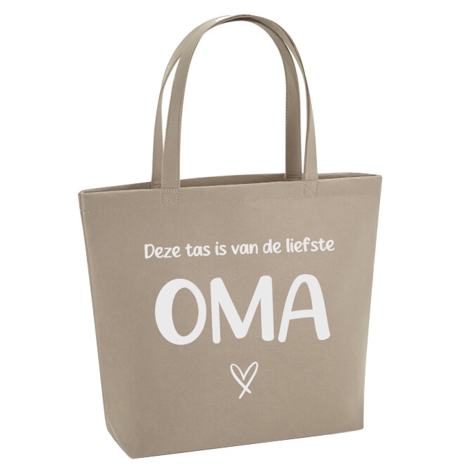 Verras oma met een prachtige en praktische vilten tas met de opdruk "Deze tas is van de liefste oma". Een speciaal cadeau waarmee ze vol trots haar boodschappen doet of een dagje op pad gaat!